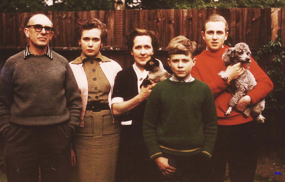 The family - 1956 - Sam, Sue, Mollie, Figaro (the cat), Nick, Me, Lisa (the dog)